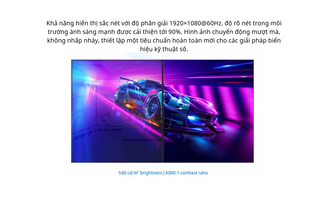Các thông số này đáp ứng tốt nhu cầu hiển thị video, hình ảnh, dữ liệu giám sát và nội dung quảng cáo trong môi trường trong nhà có ánh sáng mạnh, vận hành liên tục nhiều giờ mỗi ngày.