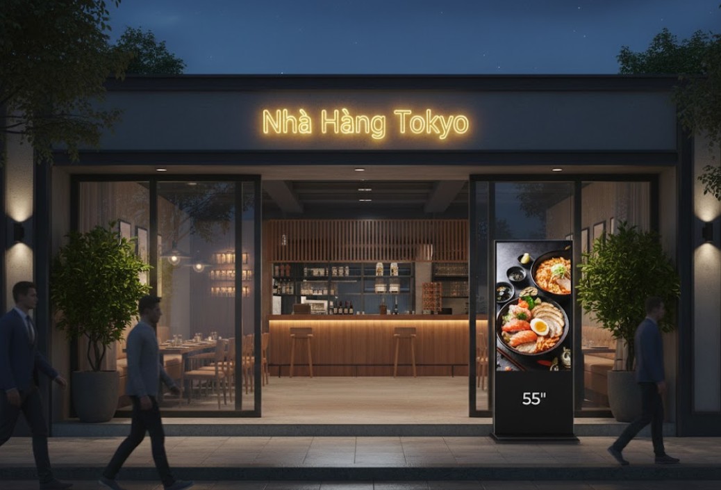 Màn hình có kích thước 55 inch, phù hợp cho các không gian trong nhà có diện tích vừa và lớn. Kích thước này đủ lớn để người xem dễ quan sát nội dung từ khoảng cách vài mét, nhưng vẫn gọn gàng để đặt ở sảnh, hành lang hoặc trước cửa hàng.