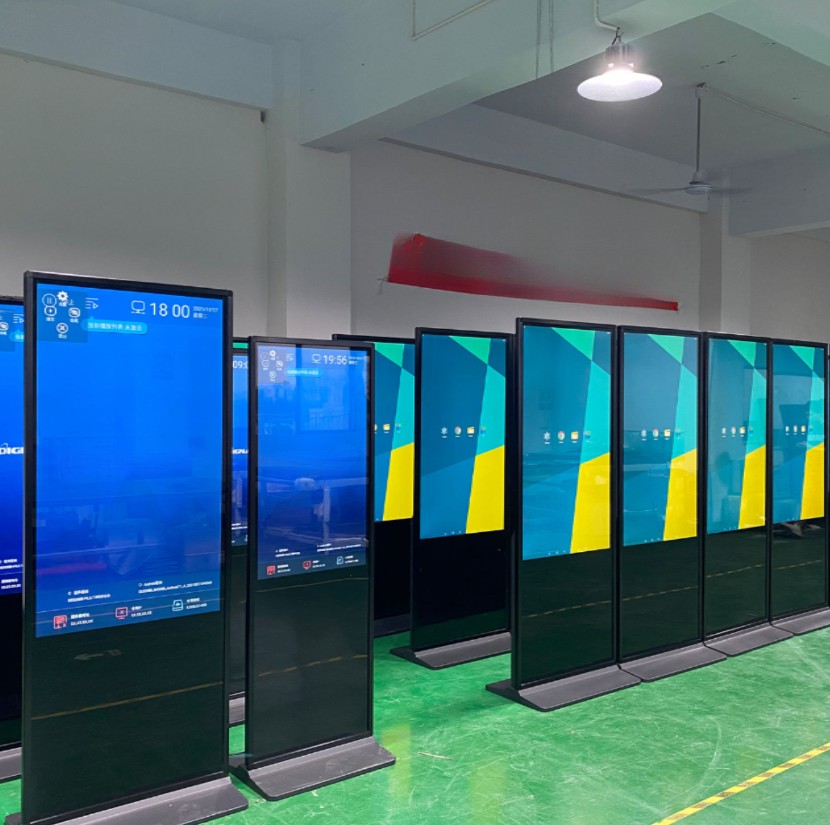Màn hình được thiết kế dạng kiosk chân đứng, đặt trực tiếp trên sàn, không cần lắp đặt phức tạp. Khung nhôm kết hợp kính cường lực giúp tăng độ bền, bảo vệ màn hình khi sử dụng lâu dài trong môi trường công cộng.