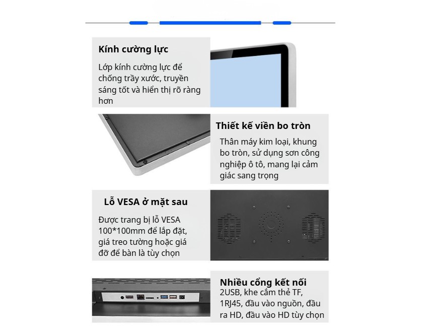 Màn hình được thiết kế theo dạng treo tường, giúp tiết kiệm diện tích và giữ không gian gọn gàng. Vỏ nhôm và kim loại kết hợp kính cường lực mang lại cảm giác chắc chắn, phù hợp cho các vị trí lắp đặt cố định.