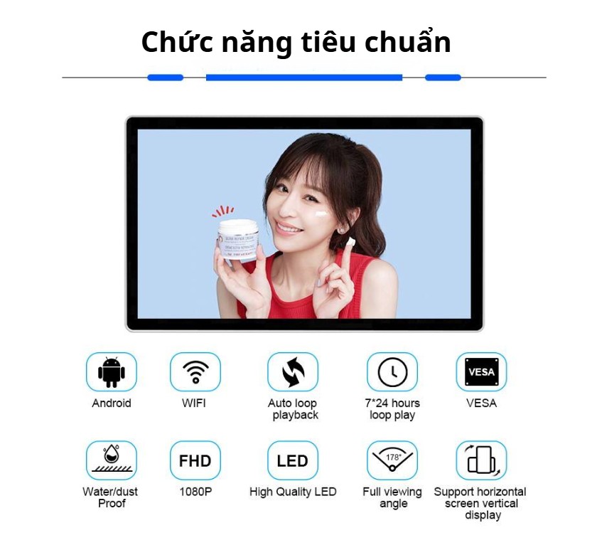 Màn hình LCD treo tường 24 inch là lựa chọn phù hợp cho các đơn vị cần một màn hình hiển thị gọn gàng, ổn định và dễ quản lý nội dung trong môi trường trong nhà. Sản phẩm tập trung vào tính thực tế, dễ triển khai và vận hành lâu dài, đáp ứng tốt nhu cầu hiển thị quảng cáo và thông tin ở những không gian vừa và nhỏ.