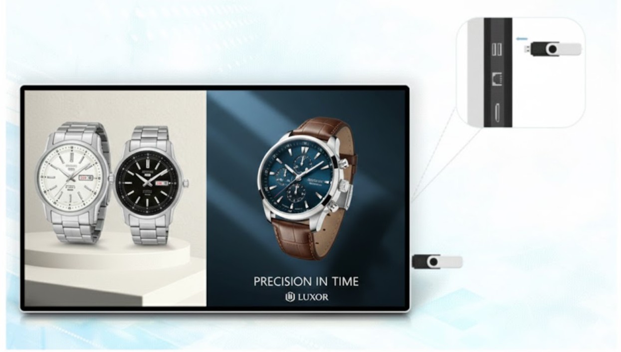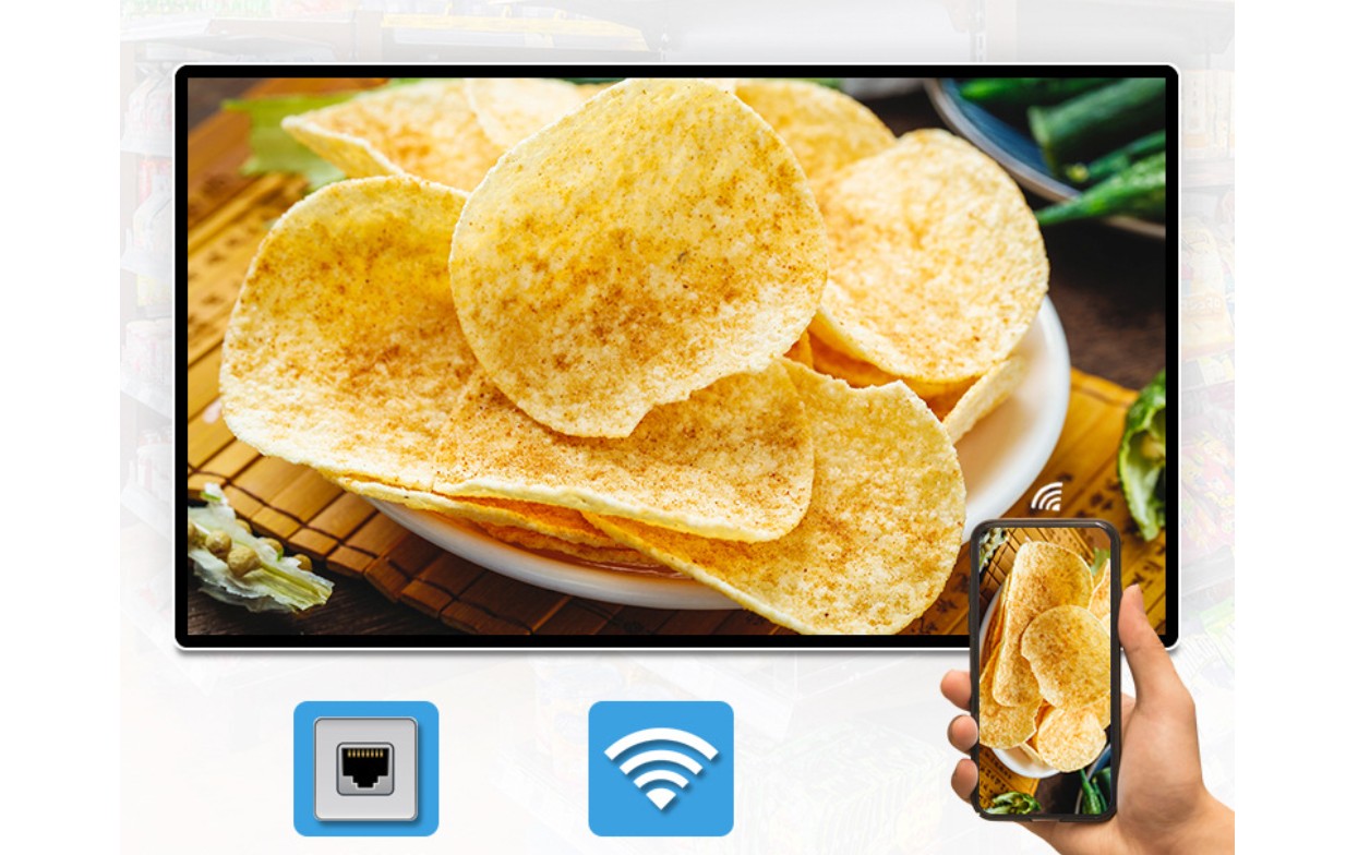 Màn hình được trang bị các kết nối thông dụng như USB, Wi‑Fi, cổng mạng LAN (RJ45) và jack tai nghe 3.5mm. Người dùng có thể phát nội dung trực tiếp từ USB, kết nối mạng để cập nhật nội dung online hoặc tích hợp màn hình vào hệ thống quản lý tập trung.